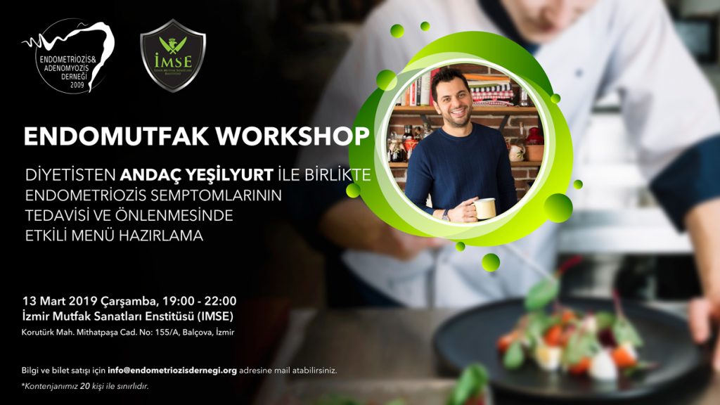 Endometriozis ve Adenomyozis Derneği olarak, sizleri endometriozis diyetinde önerdiğimiz besinlerle, ağrılı dönemlerin yaşanma süresini azaltabilmek için “ağrı kesici özellikli bir günlük menü” hazırlamaya davet ediyoruz. 13 Mart 2019 çarşamba akşamı saat 19:00’da, İzmir Mutfak Sanatları Enstitüsünde gerçekleştireceğimiz Workshop öncesinde önerilen besinleri, nedenleri ve niçinleri ile konuşup, Diyetisyen Andaç Yeşilyurt ile birlikte bir günlük örnek bir menü hazırlayacağız. Etkinliğimize katılım sınırlı sayıda kabul edileceğinden, biletler tükenmeden kaydınızı yaptırmanızı öneriyoruz. ⠀