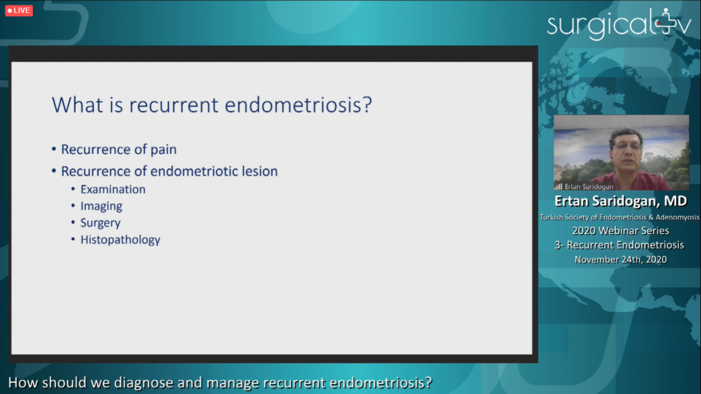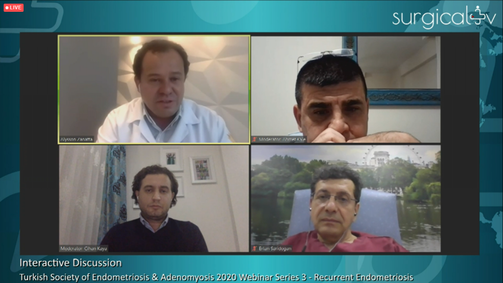 Endometriozis ve Adenomyozis Derneği olarak düzenlemiş olduğumuz webinarımızı 24 Kasım 2020 akşamı başarıyla gerçekleştirdik. Moderatörlüğünü Dr. Ahmet Kale ve Dr. Cihan Kaya’nın yaptığı webinarımıza İngiltere’den Dr. Ertan Sarıdoğan ve Brezilya’dan Dr. Alysson Zanatta katılarak “rekürren endometriozisin tanısı, medikal ve cerrahi tedavisi nasıl olmalıdır?” konularında sunumlarını gerçekleştirdiler. Son olarak, interaktif tartışma bölümünde cevabı aranan pek çok soruyu yanıtlanmaya çalışarak bilgilerimizi katılımcılarımıza aktarmaya çalıştık. Webinarımıza katılan meslektaşlarımıza ve değerli hocalarımıza sonsuz teşekkürlerimizi sunmak istiyoruz.