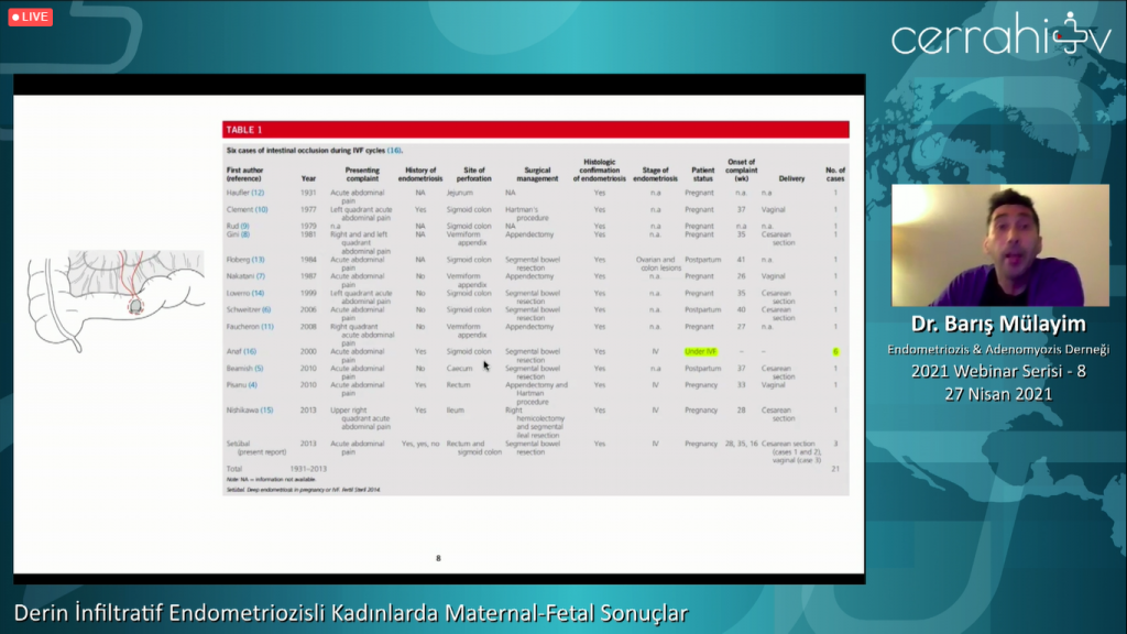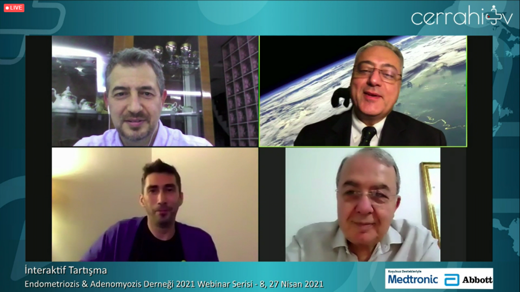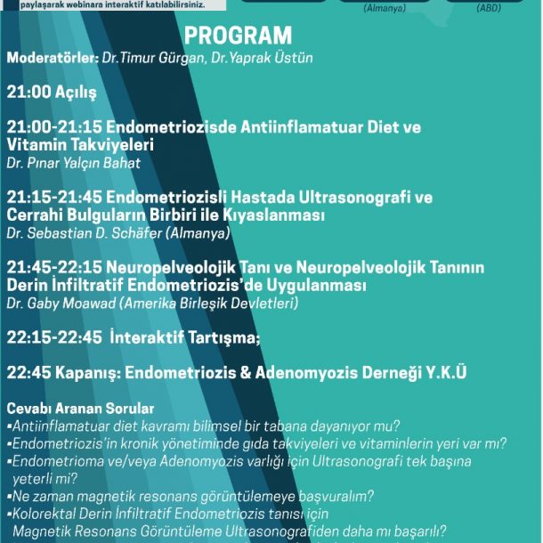 Endometriozis ve Adenomyozis derneği webinar serisine, 27 Nisan 2021 akşamı “Endometriozis ve Kötü Perinatal Sonuç Güncel Durum, 2021 Güncelleme” başlığı altında devam ettik. Dr Levent Şentürk ve Dr. İbrahim Bildirci modertörlüğünde gerçekleştirdiğimiz webinarımıza Dr Recai Pabuçcu ve Dr. Barış Mülayim sunumlarını yaparak katkıda bulundular. İnteraktif tartışma oturumuna da yer vererek, cevabı aranan pek çok sorunun yanıtlandığı webinarımıza göstermiş olduğunuz yoğun ilgi ve alaka için siz değerli katılımcılarımıza ayrıca teşekkürlerimizi sunarız.