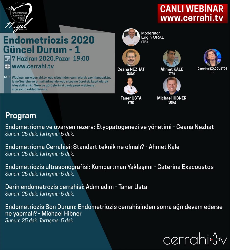 7 Haziran günü derneğimizin ilk Webinar’ını “Endometriozis 2020 Güncel Durum” başlığıyla gerçekleştiriyoruz. Detaylı programa aşağıdan ulaşabilirsiniz. Cerrahi TV‘de yayımlanacak toplantıya davetlisiniz.