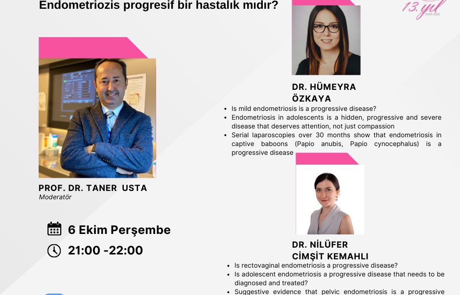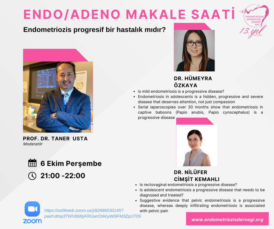 6 Ekim perşembe günü saat 21:00’de Prof. Dr. Taner Usta’nın moderatörlüğünde, Dr. Hümeyra Özkaya ve Dr. Nilüfer Cimşit Kemahlı’nın sunacağı makalelerle “Endometriozis progresif bir hastalık mıdır?” sorusunu tartıştık.
