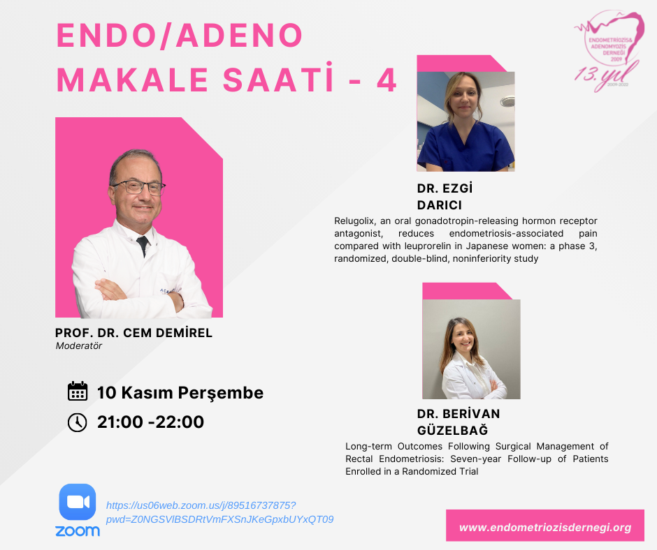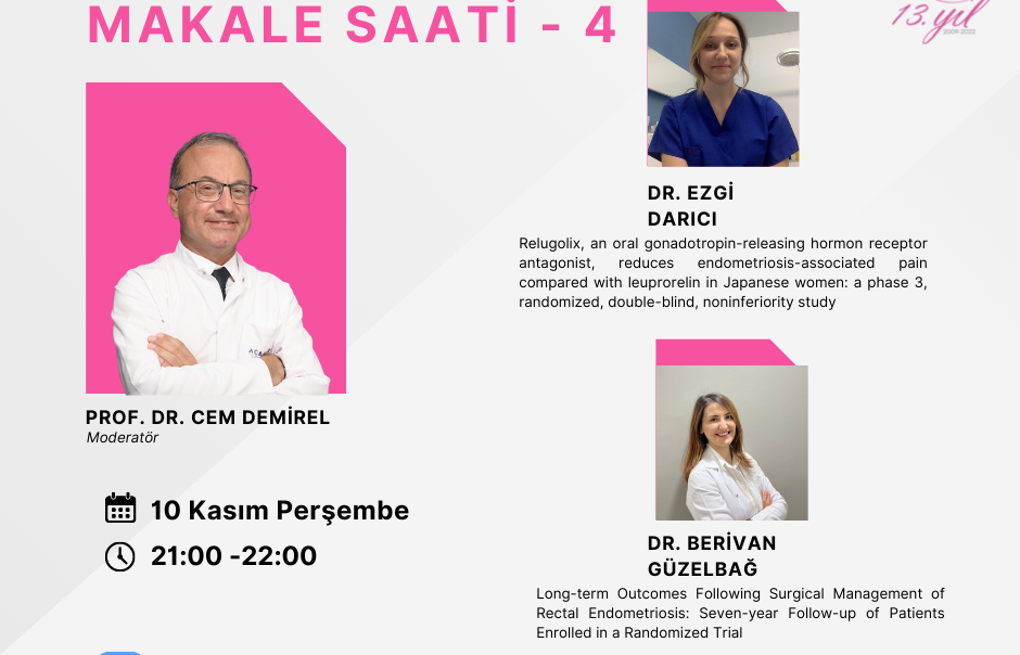 10 Kasım perşembe günü saat 21:00’de Prof. Dr. Cem Demirel’in moderatörlüğünde, Dr. Ezgi Darıcı “Relugolix, an oral gonadotropin-releasing hormon receptor antagonist, reduces endometriosis-associated pain compared with leuprorelin in Japanese women: a phase 3, randomized, double-blind, noninferiority study” ve Dr. Berivan Güzelbağ “Long-term Outcomes Following Surgical Management of Rectal Endometriosis: Seven-year Follow-up of Patients Enrolled in a Randomized Trial” sunacağı makaleleri tartışacağız.