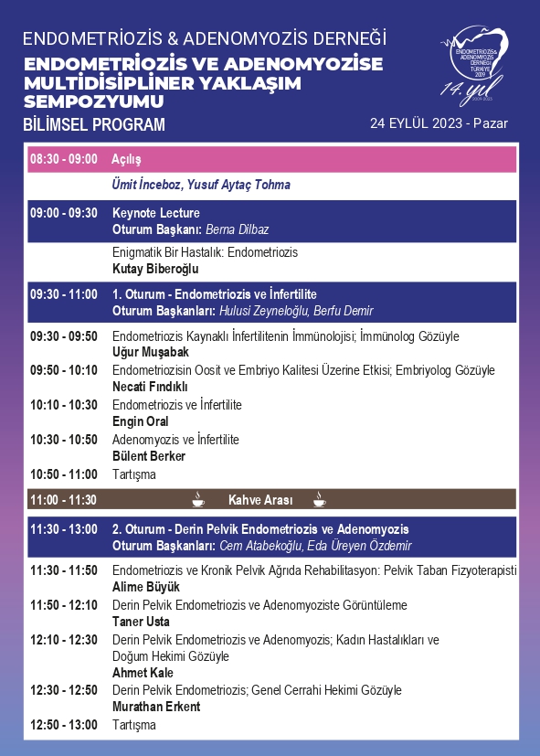 Prof. Dr. Engin Oral, Prof. Dr. Krina Zondervan, Prof. Dr. Ümit İnceboz ve  Prof. Dr. Andrew Horne başkanlığında gerçekleştirilecek olan bu toplantıda, alanında uzman bilim insanlarının katılımıyla, endometriozis ve adenomyozis etiyolojiden, bulgulara; tanı yöntemlerinden, tedavi yönetimlerine kadar her yönüyle ele alınacaktır.