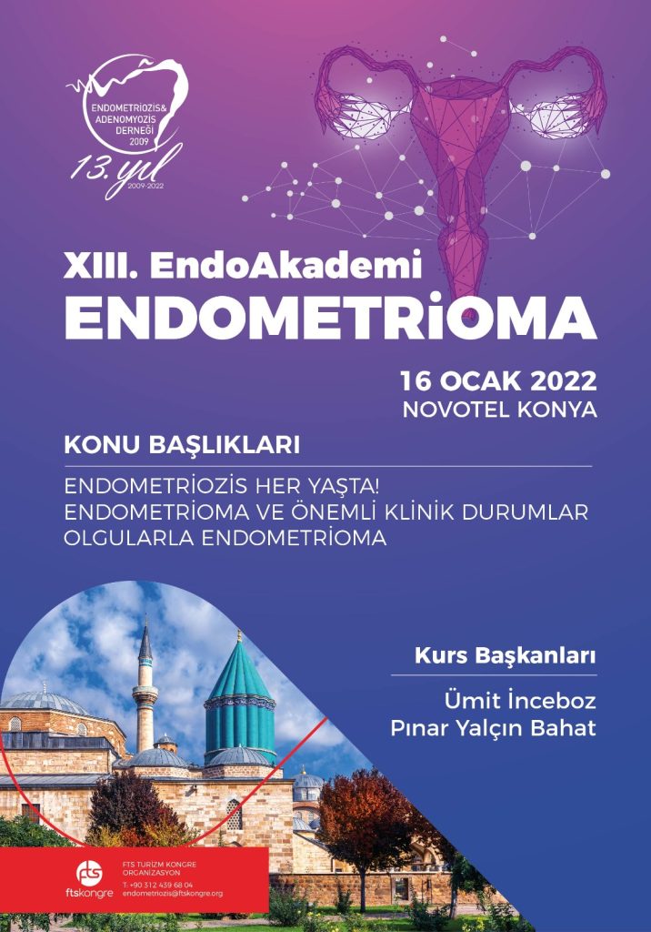 Derneğimizin Prof. Dr. Ümit İnceboz ve Doç. Dr. Pınar Bahat başkanlığında düzenlediği, Her yaşta Endometriozis, Endometrioma ve önemli klinik durumlar ve olgu sunumları ile edometrioma adlı üç oturumdan oluşan 13. Endoakademi 16 Ocak 2022’de Konya Novotel’de gerçekleştirilecektir.